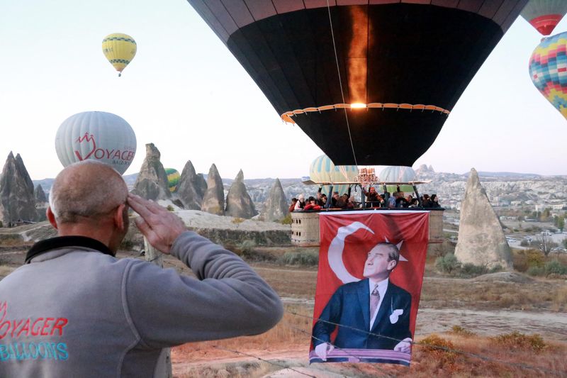 Türkiye Cumhuriyeti’nin kurucusu Gazi Mustafa Kemal Atatürk’ün, ebediyete intikalinin 81’inci yılı nedeniyle, Kapadokya’da turistlere yönelik tur düzenleyenler sıcak hava balonları sepetlerine Türk bayrağı ve Atatürk’ün resimlerini astı.