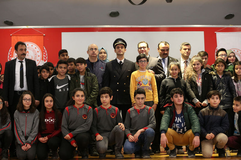 Türk Hava Yolları’nda (THY) görevli pilot 32 yaşındaki Fethi Ferhat Çataloluk, “1 Bot 1 Mont Projesi” kapsamında öğrencilerle havacılık ve pilotlukla ilgili bilgilerini paylaşıyor.