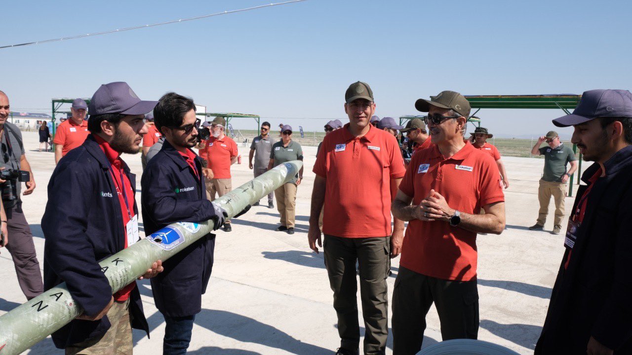 Demir, Roketsan Genel Müdürü Murat İkinci ile TEKNOFEST kapsamında düzenlenen Roket Yarışması için geldiği Aksaray’daki atış alanında, stantları gezip roketlere ilişkin bilgi aldı.