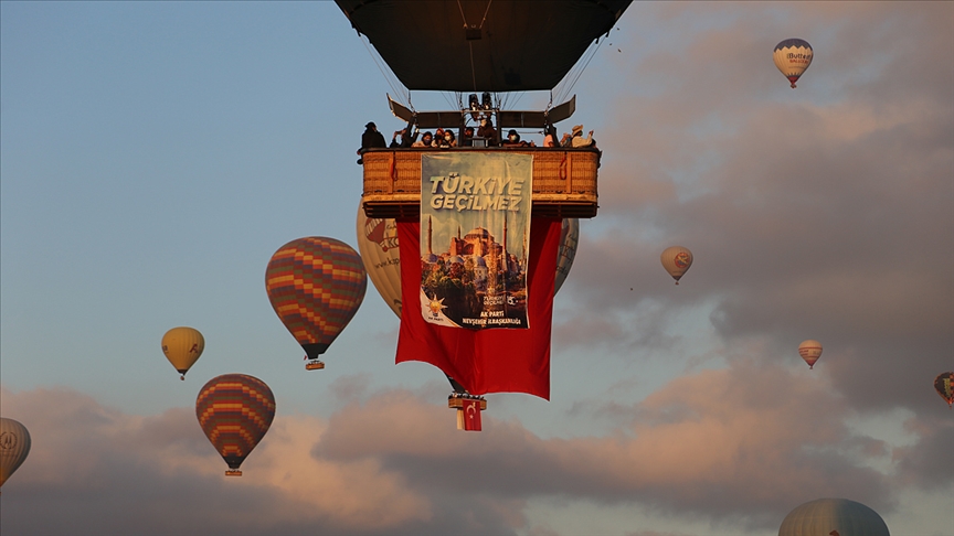 AK Parti Nevşehir İl Başkanlığınca hazırlanan “Unutmadık unutturmayacağız” ve “Türkiye geçilmez” yazılı pankartlar ve Türk bayrakları sıcak hava balonlarının sepetlerine asıldı.