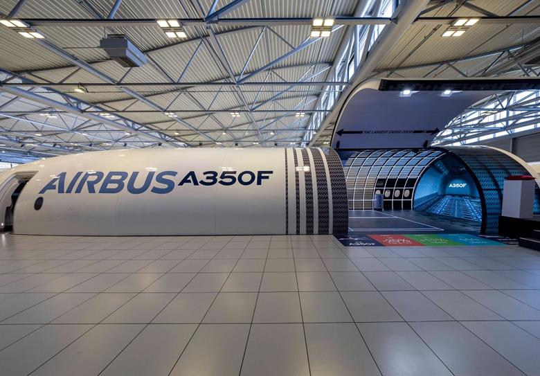 Airbus, A350 kargo uçağının birebir maketinde ana güverte kapısının boyutunu vurguladı. XL” olarak markalanan uçağın ana güverte kargo kapısı 4,3 metre genişlikle piyasadaki en büyük olacağı belirtildi.
