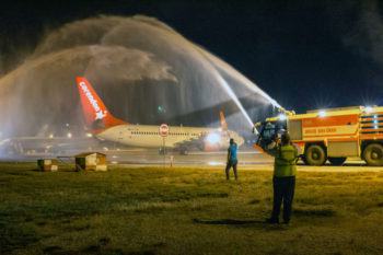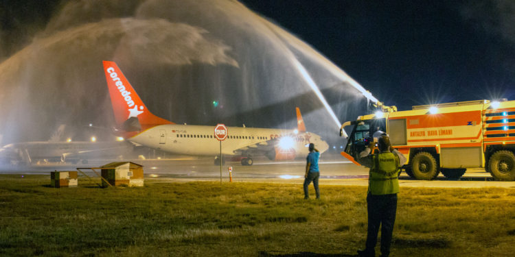 Corendon Airlines’ın Düsseldorf – Antalya seferini gerçekleştiren XC 5804 uçuş kodlu uçağı, 130 yolcusu ile Fraport-TAV Antalya Havalimanı’na 27 Haziran 2020 saat 00:20’de iniş yaptı. Bir havacılık geleneği olan su takı ile karşılanan Corendon’un sezondaki ilk yolcuları uçaktan maskeli ve sosyal mesafeli bir şekilde indi.