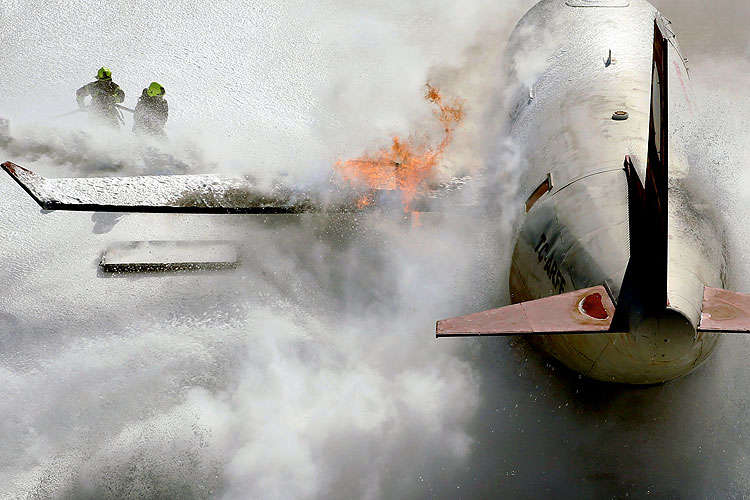 Tatbikatta, senaryo gereği iniş sırasında pist başına düşen bir uçağın motorlarında çıkan yangına müdahale edildi.