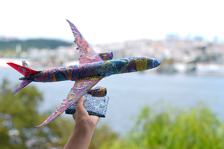 “Dedim ki ‘Neden bizim uçaklarımızda da böyle bir şey uygulamıyorum, neden yapılmıyor?’ Bunu o zaman düşünmüştüm. Geçen sene ağustosta bir ay orada kaldım. Döndüğümde 4 ay sonra bana Türk Hava Yollarının bir maket uçağı hediye edildi. Dediler ki ‘Venezuela Büyükelçisine bu uçağı takdim edeceğiz. Bunu sana hediye ediyoruz ama sen bunu başka bir forma dönüştürürsün.’ Böyle bir şeyden bahsetmişti bir arkadaşım. Uçağı kendi motiflerimizle boyayıp Venezuela’nın bayrağının renkleriyle renklendirip temmuz ayında büyükelçiye takdim ettim. Büyükelçi ağladı, çok etkilendi bu uçaktan. Dedi ki ‘Türk Hava Yolları bizim için çok önemli. Çünkü bizi dünyaya taşıdı. Kimse bize yol olmazken Türk Hava Yolları bize yol oldu.’ O ağladıktan sonra çok etkilendim bu hikayeden. Demek ki biz çok etkili bir şey yapıyoruz. Sanatın işte burada etkili bir gücü var. Sadece boş bir uçağı vermenin yanı sıra oradaki makete anlam yükleyip vermek onu hissetmesini sağladı.”