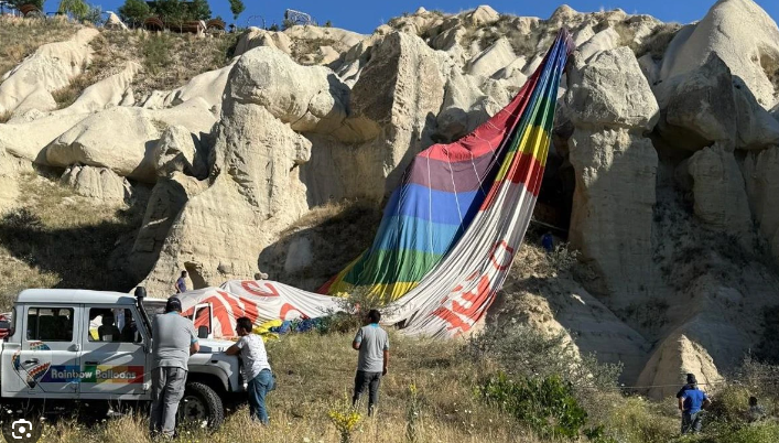 Kapadokya’nın Avanos ilçesine bağlı Çavuşin köyünden havalanan sıcak hava balonlarından bir tanesi Göreme beldesinde bulunan Aşk Vadisine geldiğinde ters rüzgara kapıldı.