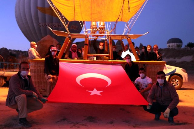Yerli ve yabancı turistler, güneşin doğuşuyla başlayan ve yaklaşık 1,5 saat süren uçuşta peribacalarını arasında süzülerek hem yörenin doğal güzelliklerini izlemenin keyfini çıkartırken hem de 30 Ağustos Zafer Bayramı coşkusuna tanıklık etmenin heyecanını yaşadı.