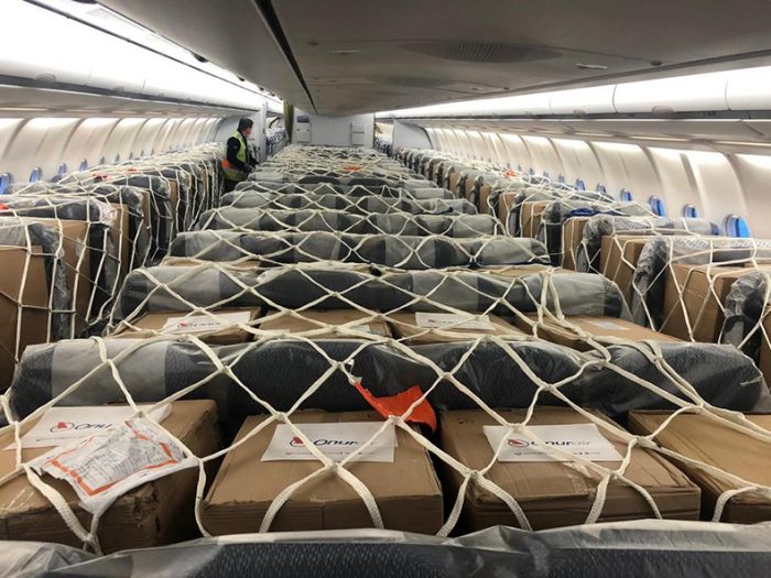 Şirketin geniş gövdeli ve çift koridorlu Airbus A330 tipi uçaklarıyla düzenlenen uçuşlarda sağlık kuruluşlarında kullanılmak üzerine üretilen tek kullanımlık önlükler taşınıyor.