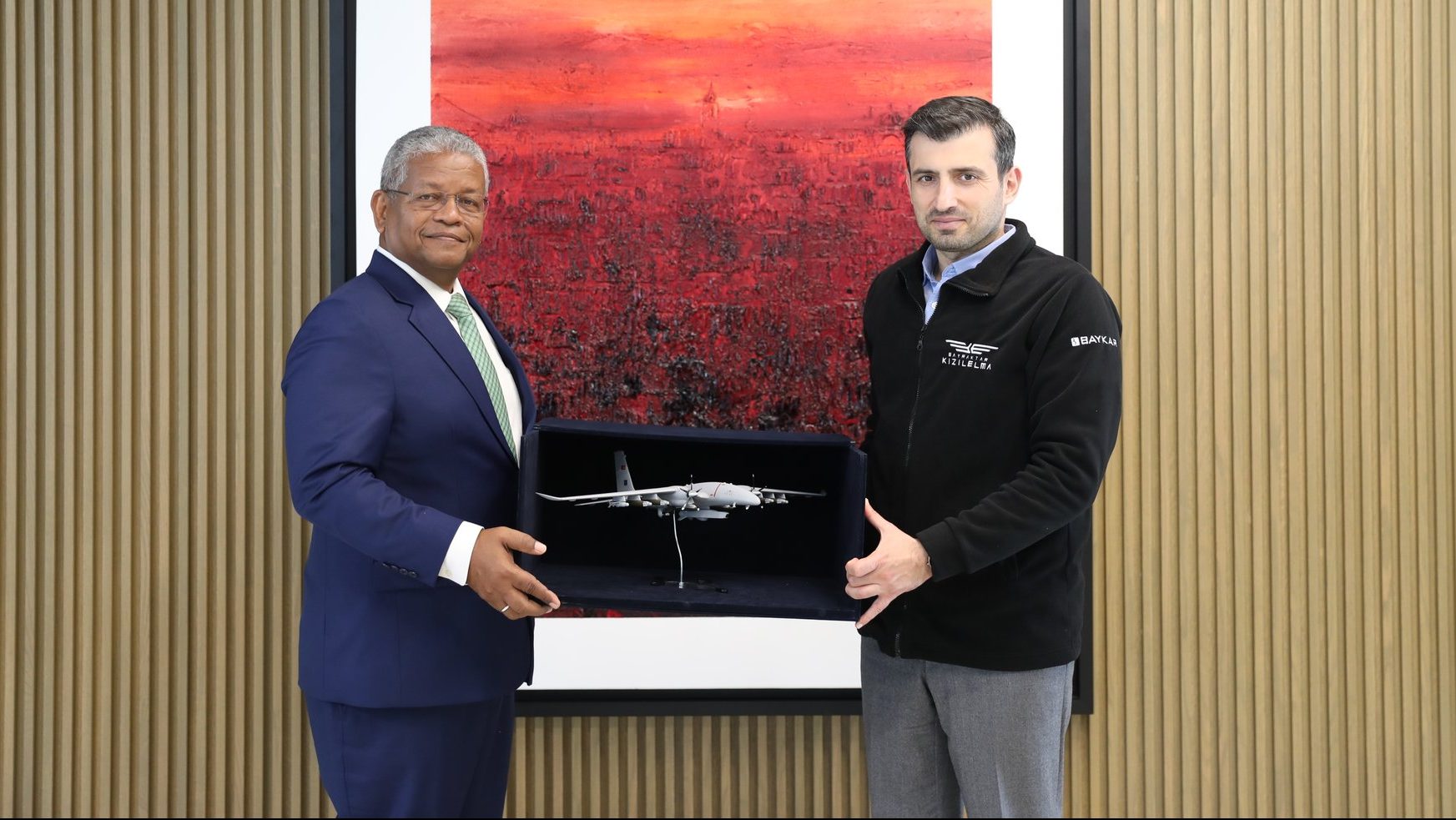 Bayraktar, ziyaretin anısına Ramkalawan’a Akıncı TİHA’nın maketi takdim etti.