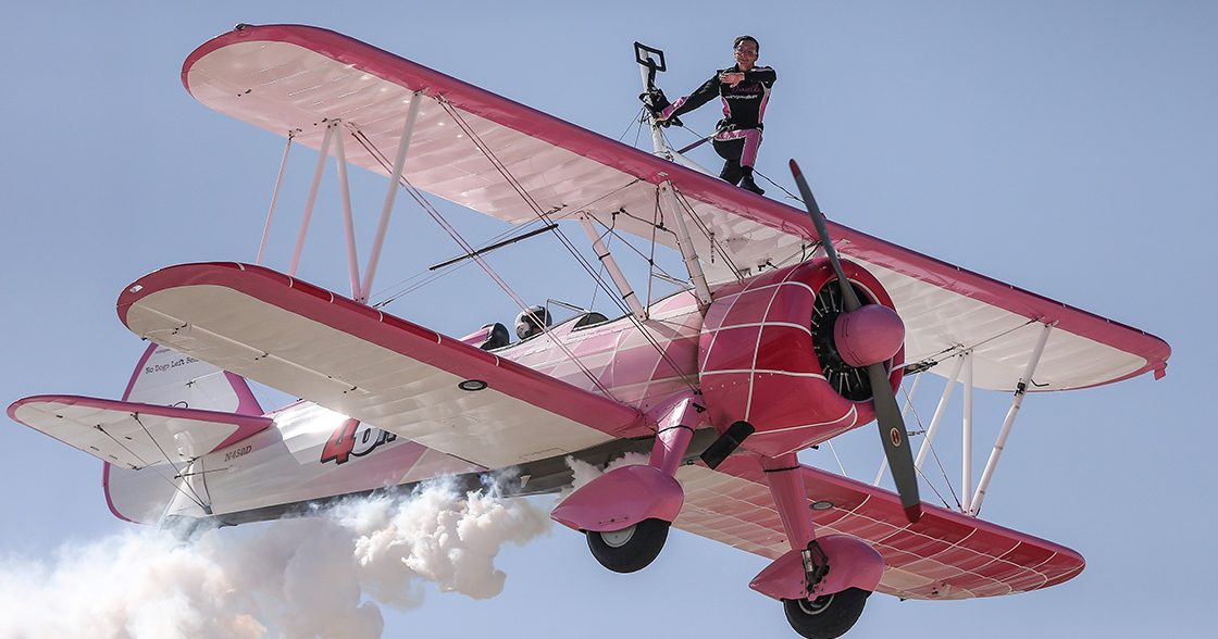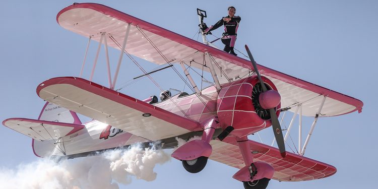 İsviçreli Danielle Del Buono, uçuş sırasında pilot Emiliano Del Buono kontrolündeki Boeing Stearman tipi uçağın kanadında yürüdü.