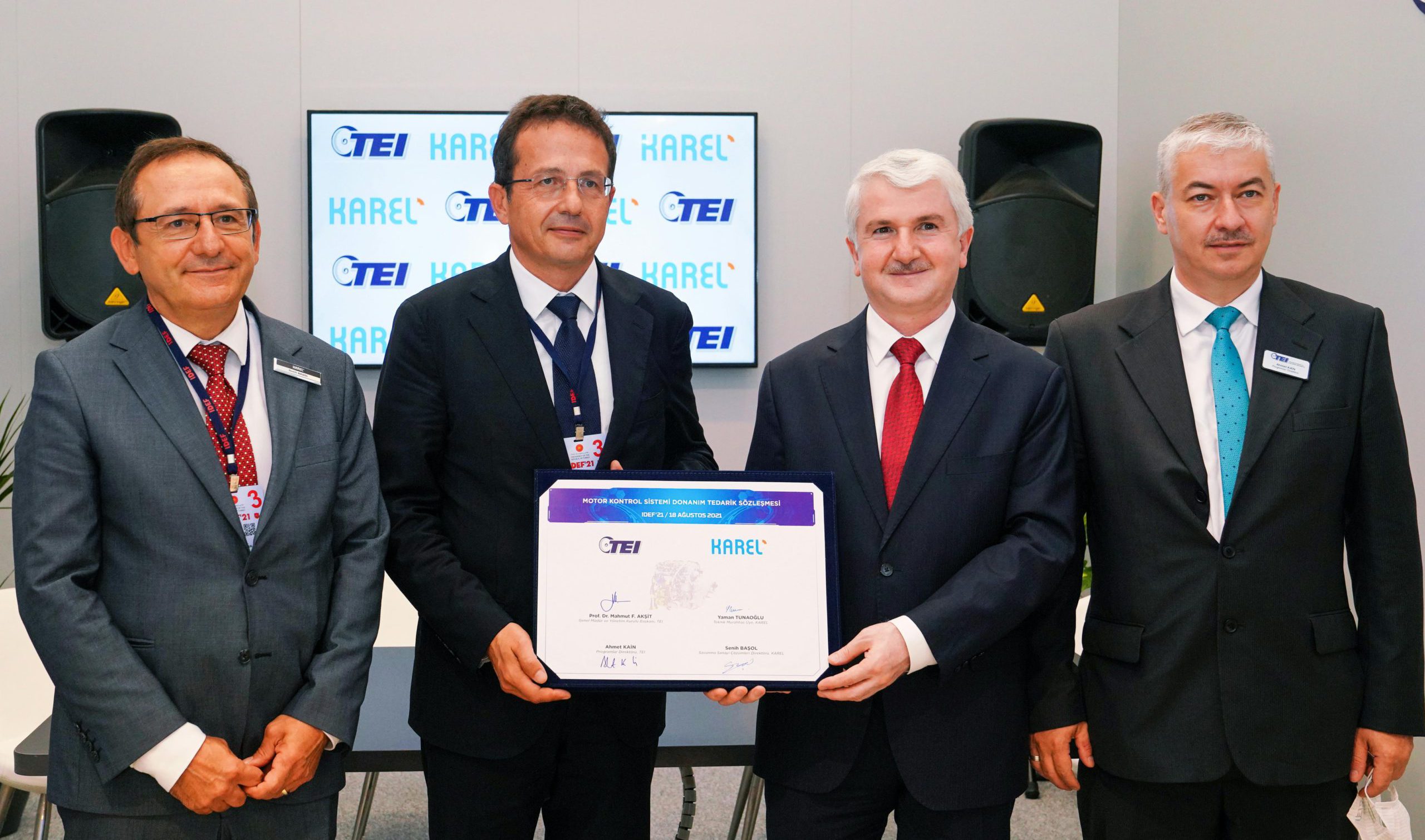 IDEF 2021’in ikinci gününde, TEI standında gerçekleşen imza törenine TEI Genel Müdürü ve Yönetim Kurulu Başkanı Prof. Dr. Mahmut F. Akşit, TEI Programlar Direktörü Ahmet Kain, Karel Teknik Murahhas Üye Yaman Tunaoğlu ve Karel Savunma Sanayi Çözümleri Direktörü Senih Başol’un yanı sıra iki şirketin üst düzey yöneticileri katıldı.
