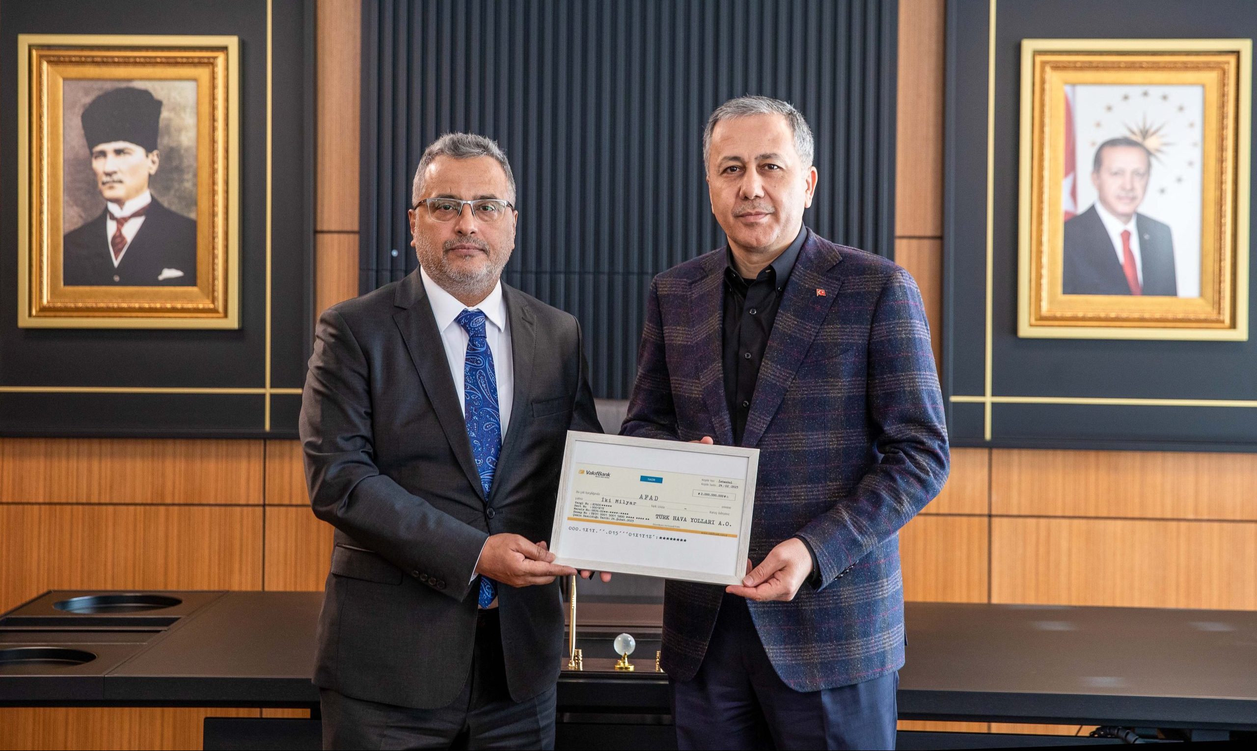Türk Hava Yolları (THY) Yönetim Kurulu ve İcra Kurulu Başkanı Ahmet Bolat, “Türkiye Tek Yürek” kampanyası kapsamında şirketin açıkladığı 2 milyar TL değerindeki çeki İstanbul Valisi Ali Yerlikaya’ya teslim etti.