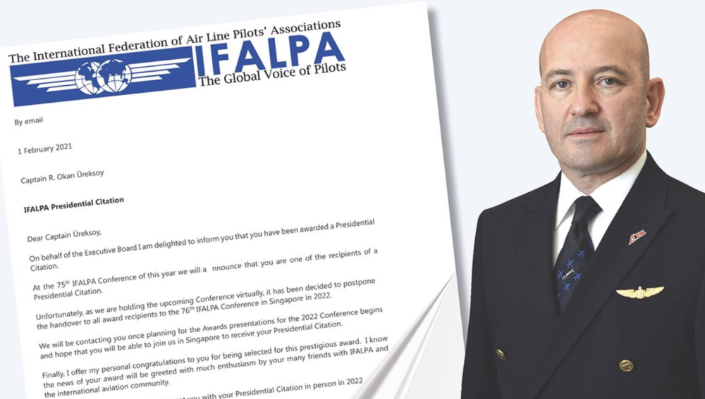 TALPA’dan yapılan açıklamada,”Derneğimiz Genel Sekreteri Kpt. Plt. R. Okan Üreksoy, Şubat 2020’de meydana gelen Pegasus Hava Yolları kazasını takiben havacılık kazalarının incelenmesi sürecinin pilotlara cezai sorumluluklar yönünden ICAO ve IFALPA tarafından kabul edilen normlar çerçevesinde yürütülmesi konusundaki çabaları üzerine, üst düzey bir ödül olan “IFALPA PRESIDENTAL CITATION” ödülüne layık görülmüştür. Bu büyük başarıyı sizlerle paylaşmaktan sonsuz mutluluk duyuyor ve kendisini tekrardan tebrik ediyoruz” ifadeleri kullanıldı.