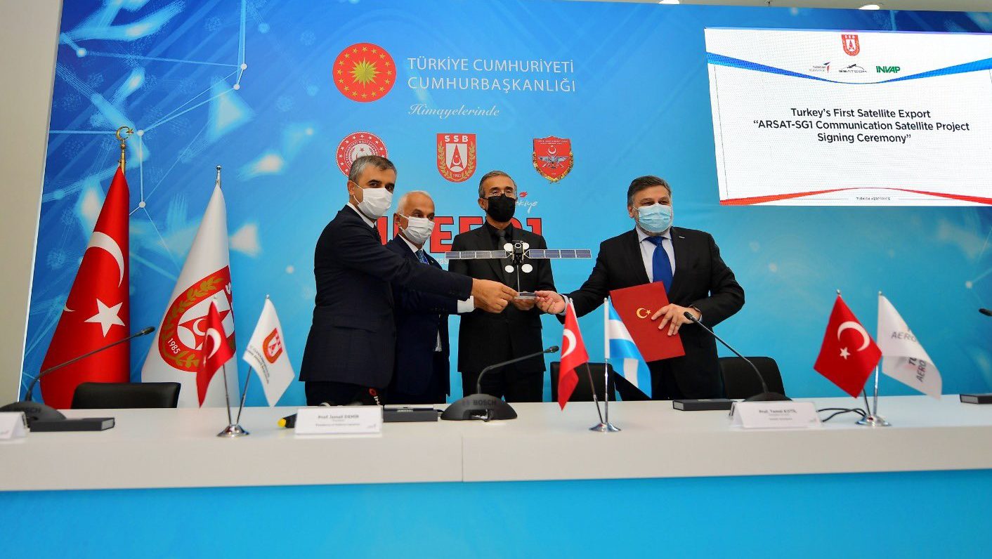 Cumhurbaşkanlığı Savunma Sanayii Başkanlığı himayesinde TUSAŞ, GSATCOM ve INVAP arasında Türkiye’nin ilk uydu ihracatı olan ARSAT-SG1 Uydu Projesi’nin imza töreni, Uluslararası Savunma Sanayii Fuarı’nda (IDEF 2021) gerçekleştirildi.