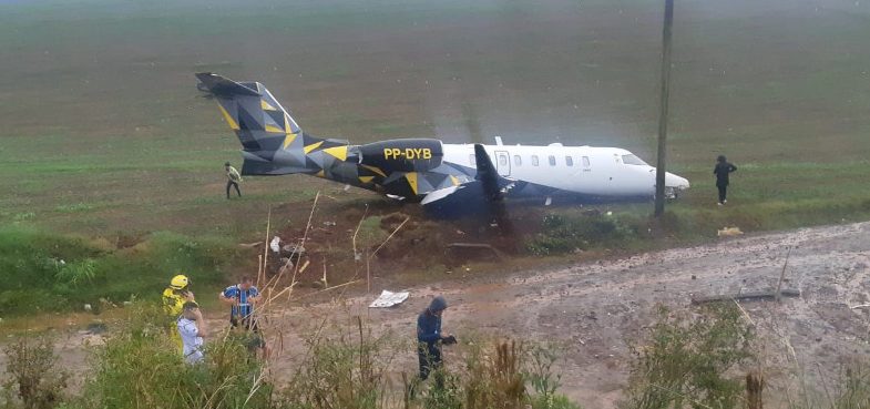 Brezilya’daki Erchim Havalimanı’na inmek isteyen iş jeti yoğun yağış nedeniyle piste tutunamayarak kaydı.