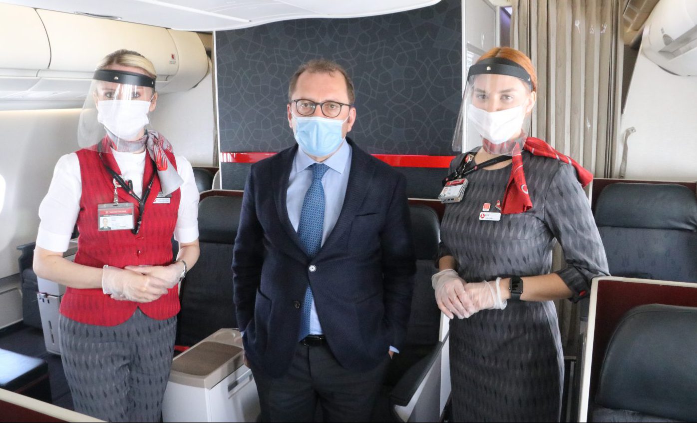 Türk Hava Yolları kabin ekibi maske, siperlik ve eldivenle hizmet verdi.