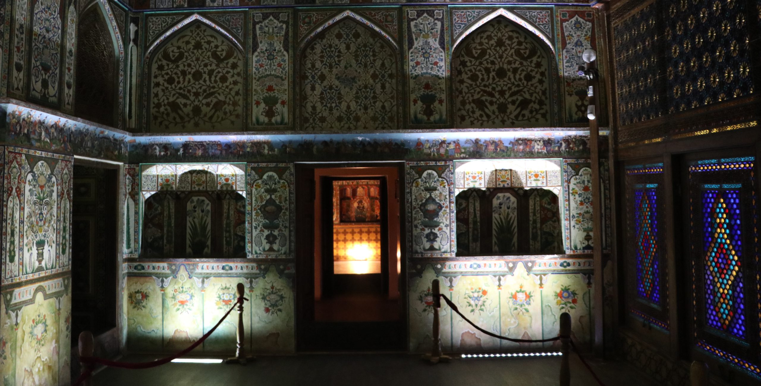 İki kat, altı oda ve iki aynalı balkondan oluşan sarayın salon ve odalarının duvarları renkli işlemeler, motifler ve savaş sahnelerinin yansıtıldığı duvar resimleriyle süslü.