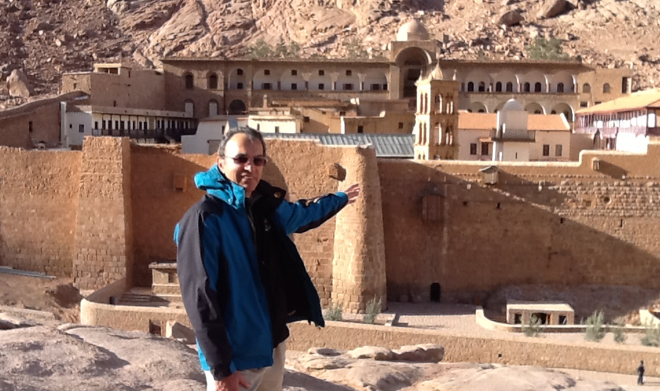 “Ekoptus” Helence Mısır demekmiş. “Kıpti” sözcüğü oradan geliyormuş. Bizim ve kendilerinin kullandığı Mısır kelimesi ise ülke anlamına gelmekteymiş. 4. Yüzyılda Roma İmparatoru Konstantin zamanında annesi, St Catherine’i buralara yollamış. Manastırın ismi oradan geliyormuş. 6. Yüzyılda Bizans imparatoru Jüstinyen zamanında, Mısır’da herkes Hırıstiyan olmaya zorlanmış. Bu ortodoks manastırı da o dönemde yapılmış. Jüstinyen, manastırın Sina Dağı’na yapılmasını istemiş ama taş taşımanın zorluğu, dağdaki şiddetli rüzgar ve soğuk nedeniyle aşağıdaki vadiye yapmışlar. Jüstinyen sonunda Sina’ya gelmiş ve manastırın dağda değil vadide olduğunu görünce çok sinirlenmiş ve mimarı öldürtmüş. Mezarı manastırın yanında. Manastırın içerisinde 12. yüzyıldan kalma bir mescit var. Halife Hakim’in ordusuyla ziyarete geleceği duyulunca alelacele yapılmış. Manastırı yıkmasın diye… Ama zaten halifenin amacı sadece ziyaretmiş. Mescidin kıblesi kiliseninki gibi Kudüs’e bakıyormuş, yani Mekke’ye değil. O zaman kıble Kudüs’müş. Manasırda halen görev yapan papazların çok önemli bir bölümü Yunanistan’dan geliyormuş.
